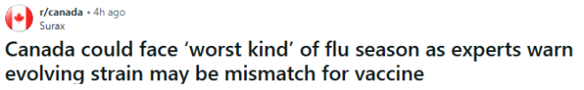 声明指出:“现在还太早判断今年加拿大的流感季会有多严重——这取决于哪种病毒株占主导、是否同时流行其他呼吸道病毒、疫苗的效果以及接种率等因素。”